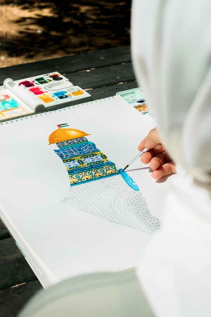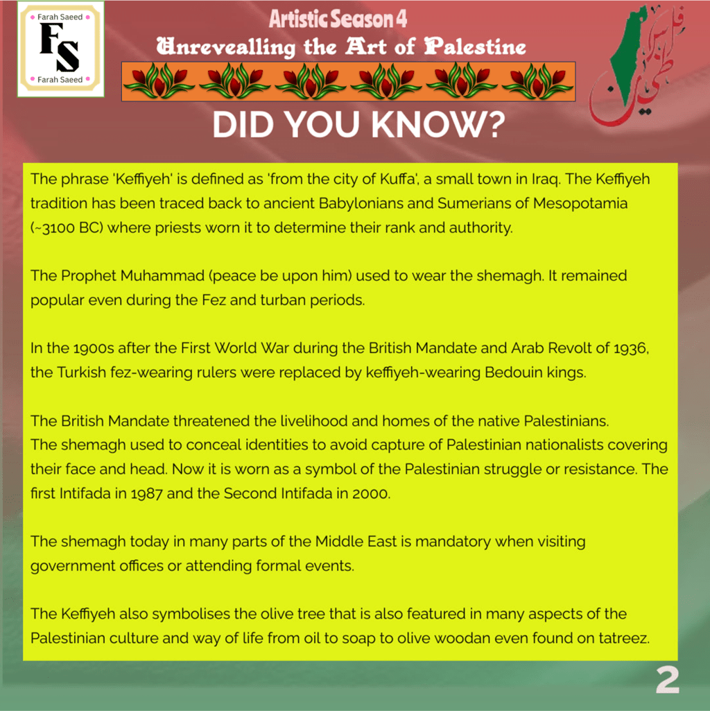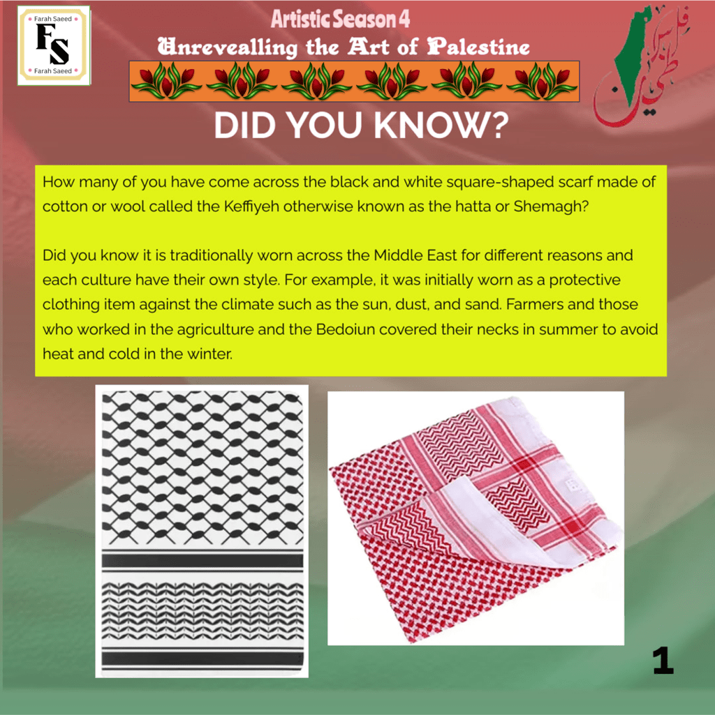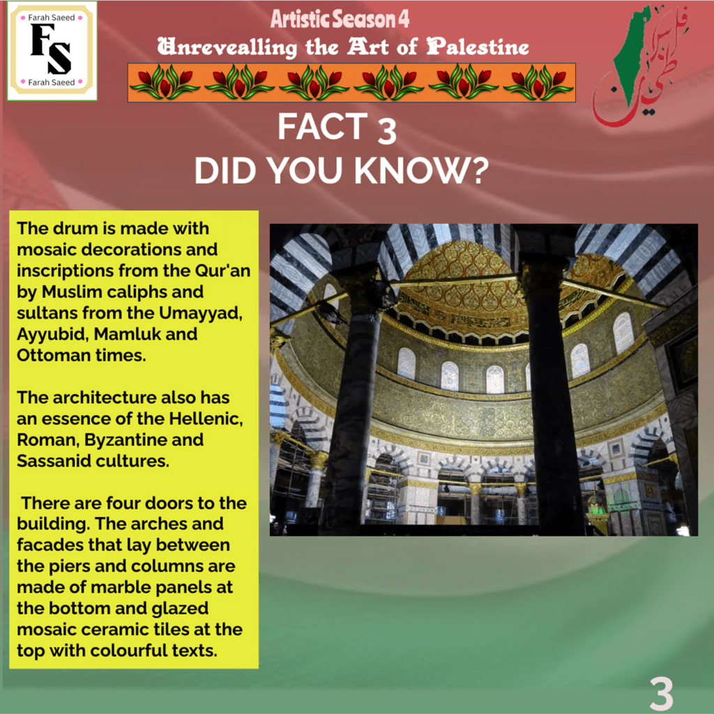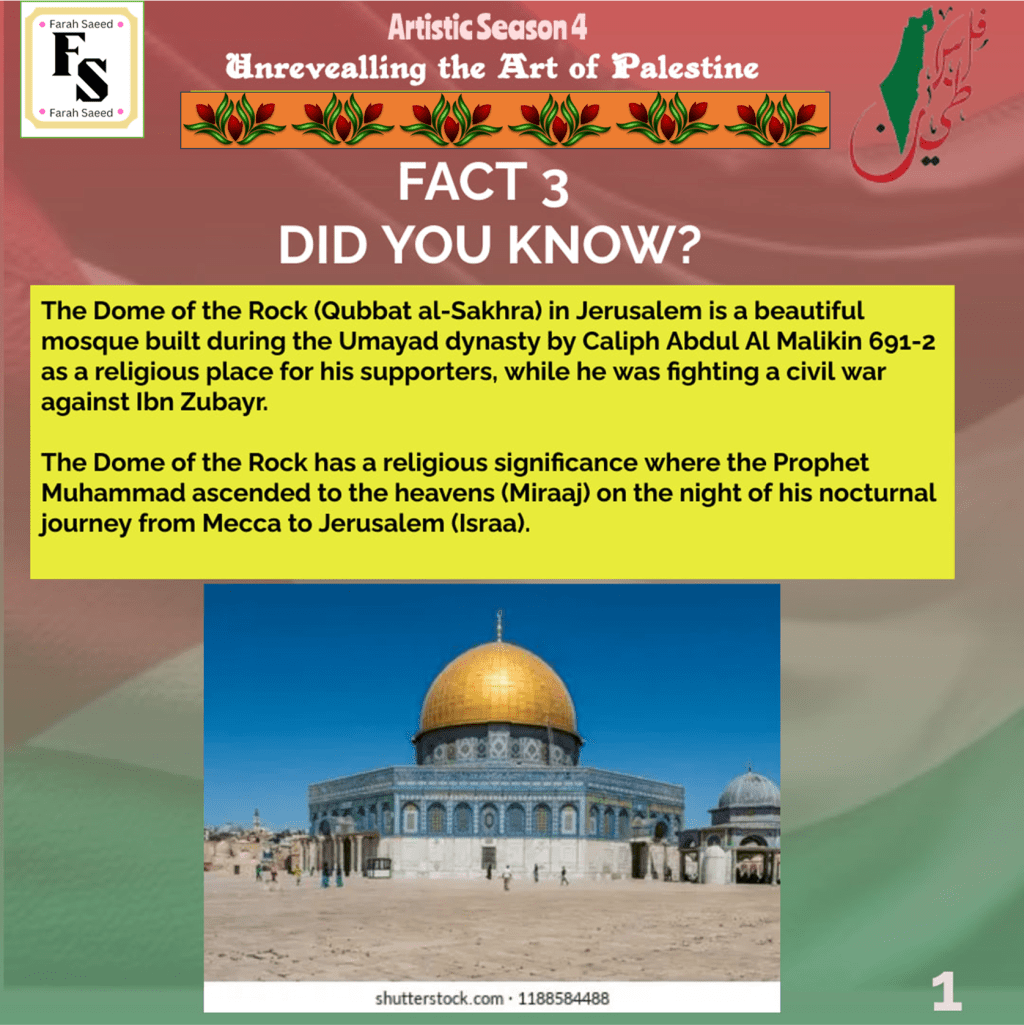 Till this day, there is a lot to learn about the Palestinian art and culture, from delicious food to monuments, embroidery, garments, and other traditional customs. On 10th August 2022, we held our fourth virtual art exhibition titled ‘Unrevealing the beauty of Palestinian Art’, whose submissions were open to all backgrounds and ages with the aim of unifying respect and unity to create a peaceful atmosphere in the Middle East. We have also provided an insight into the art and cultural customs, such as the origins of Tatreez embroidery, the Dome of the Rock, and the Keffiyah.