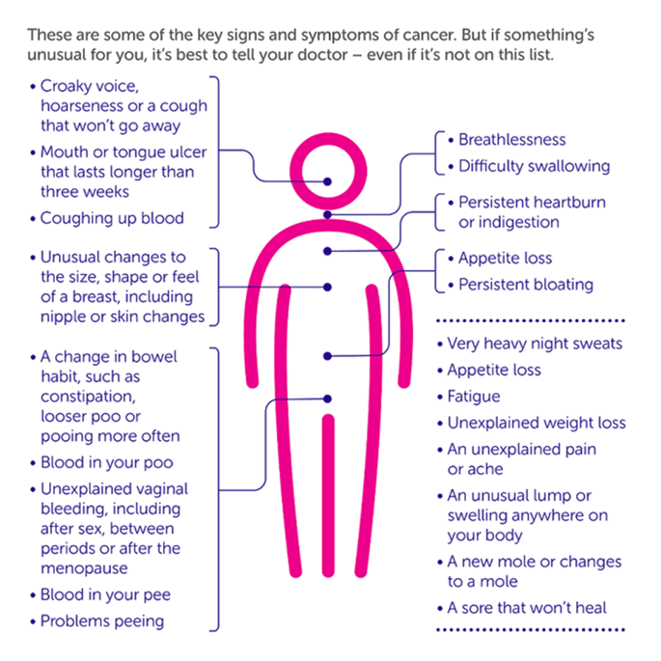 Cancer Research UK (2022) Signs And Symptoms of Cancer. Available at: https://www.cancerresearchuk.org/about-cancer/cancer-symptoms (Accessed: 18th April 2025)