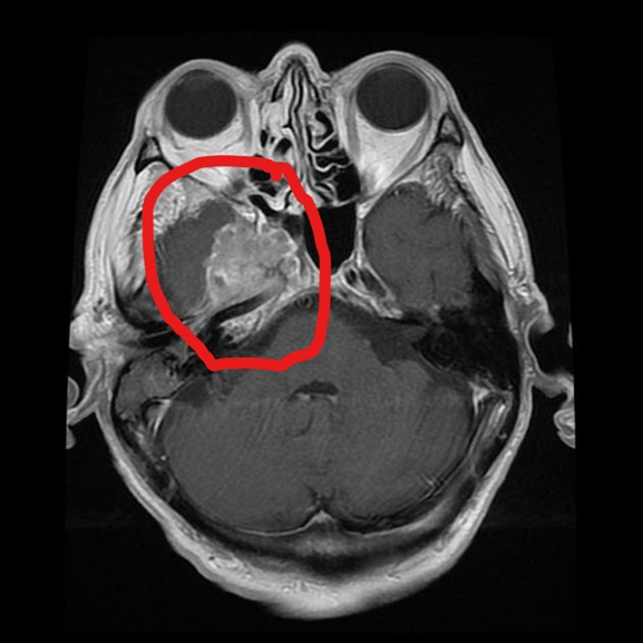 Figure 8: MRI scan of the brain. The tumour is marked with a red outline in an axial plane