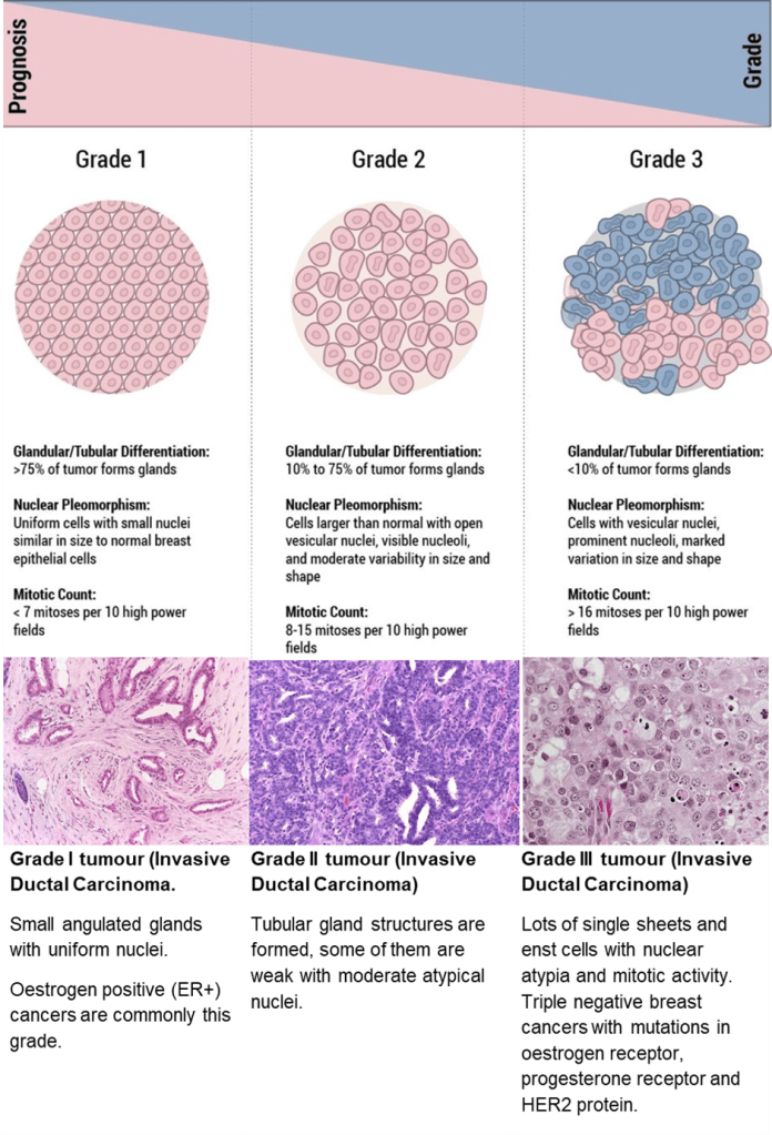 A grade is then assigned to the patient’s tumour and presents the likelihood that cancer can spread. For example, with low-grade tumours, surgical removal of the tumour might be sufficient for its eradication. Contrastingly, high-grade tumours might require a more targeted treatment, several sessions of chemotherapy, or certain types of drugs. For example, in cancers such as the breast, grading is in coordination with the Nottingham Histologic Score also known as the Elston-Ellis modification of the Scarff-Bloom-Richardson grading system (John Hopkins University, 2025). Three factors influence the scores: differentiation, pleomorphism, and mitotic count; each component has a score between 1 to 3. Differentiation refers to how well tumour cells are producing normal mammary glands. The pleomorphism refers to the features of the nucleus in the tumour cells. Mitotic count presents how active the cells are by mitosis (John Hopkins University, 2025). The total scoring range for Grade I tumours is between 3 and 5 and is less aggressive. Grade II tumours have a scoring range between 6 and 7 whereas, Grade III tumours have a scoring range between 8 and 9 and are more aggressive (John Hopkins University, 2025). An illustration of each grade and its respective features is in Figure 15.
