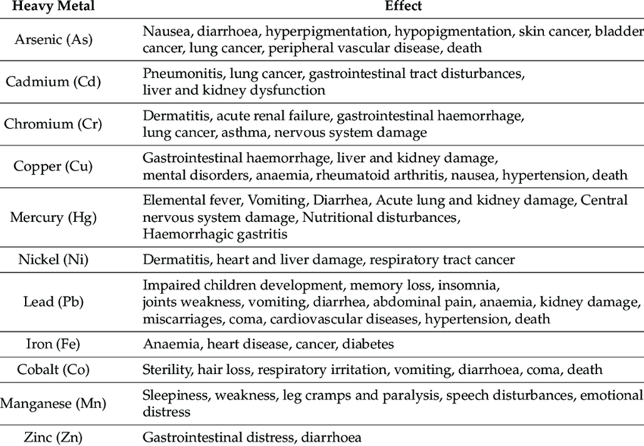 Table 1: A summarised list of heavy metals in the industry and its effect on health (Whitehead et al., 2021)
