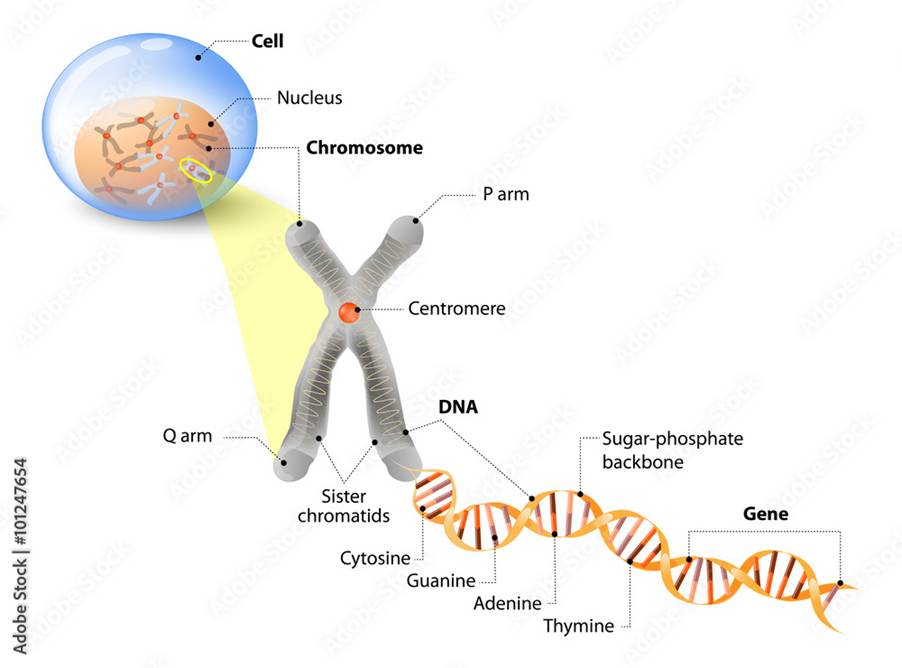 In the nucleus, there are threadlike structures called chromosomes containing the DNA. The DNA molecule has genetic information to control the cell. The gene is in a fixed position called the locus on the DNA where each gene codes for a protein. The DNA consists of many nucleotides bound together to form a polynucleotide – please see Figure 2. Each nucleotide contains a phosphate, five-carbon deoxyribose sugar, and nitrogenous base. The phosphate group is negatively charged and provides the DNA with acidic properties. It is attached to the 5’ carbon of the sugar molecule. Deoxyribose sugar refers to the sugar losing an oxygen atom ‘de-oxy’. There are four nitrogenous bases: cytosine ( C), Guanine (G), Thymine (T), and Adenine (A). They have specific complementary base pairing to express the genetic material: Adenine with Thymine whereas Cytosine associates with Guanine (Brooker et al., 2008). The structure of the nucleotide illustrated in Figure 3.