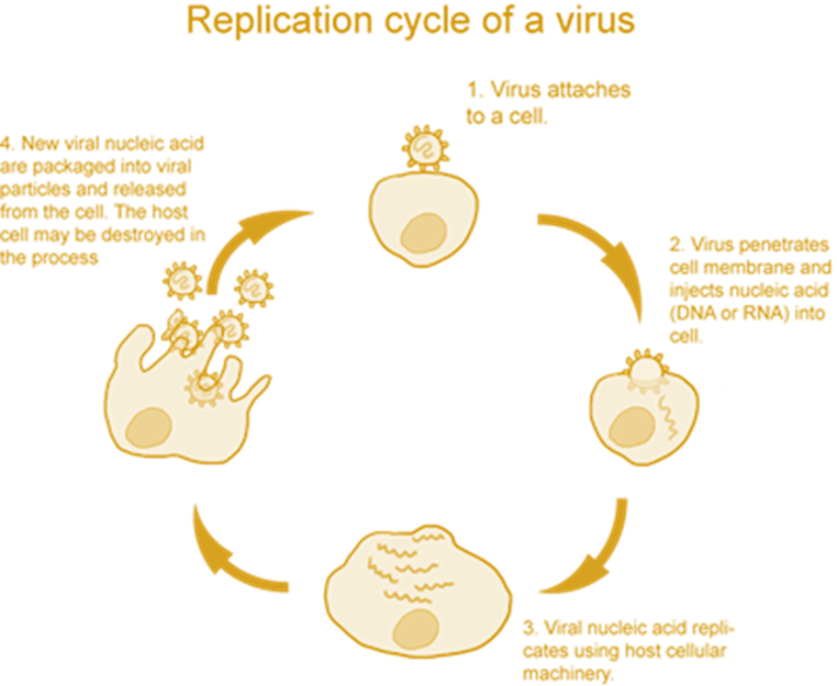 The replication and growth of viruses have five phases: adsorption, penetration, replication, assembly of viral capsid, and virion release – please see Figure 9. Adsorption is where the virus attaches to the cell by interacting with the receptor proteins on the cell surface. Most are glycoproteins (sugar head and protein tail) and are involved in the immune system. Glycoproteins can join hormones or other molecules to help the cell to function appropriately. Some viruses are specific to particular organisms or tissues within the host. Lipid rafts help viruses to enter as many of its receptors of enveloped viruses can bypass these protective barriers and enter the host cell (endocytosis). Some viruses can inject nucleic acid. Other viruses ensure the RNA/DNA polymerase enzyme can enter the host cell to produce viral DNA and RNA in the nucleus. Other viruses halt the host’s DNA, RNA, and protein synthesis and can stimulate its macromolecules. Late genes produce capsid proteins around the new virions (Sherwood, Woolverton, and Willey, 2007).