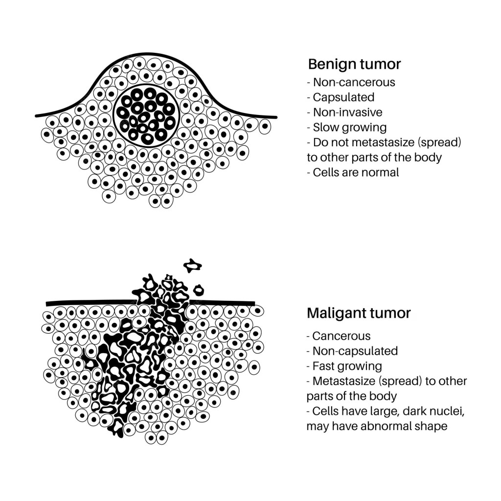 Figure 2: The transformation of a non-cancerous cell (benign) to a malignant cancer cell depends on the number of mutations expressed that alter how the cancer cell looks (phenotype).