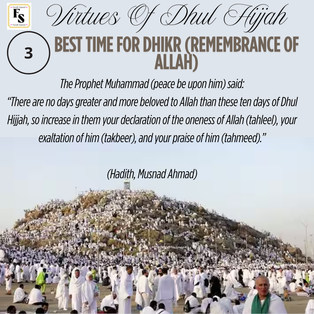 “There are no days greater and more beloved to Allah than these ten days of Dhul Hijjah, so increase in them your declaration of the ones of Allah (tahleel), your exaltation of him (takbeer), and your praise of him (tahmeed).”