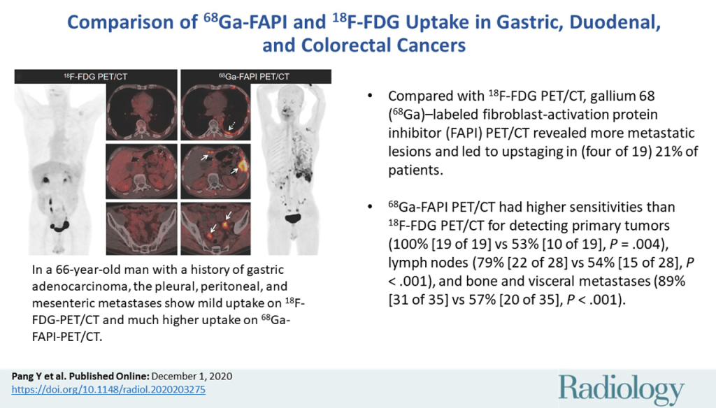 Pang, Y., Zhao, L., Luo, Z., Hao, B., Wu, H., Lin, Q., Sun, L. and Chen, H. (2021). Comparison of 68Ga-FAPI and 18F-FDG Uptake in Gastric, Duodenal, and Colorectal Cancers. Radiology, 298(2), pp.393–402. doi:https://doi.org/10.1148/radiol.2020203275.