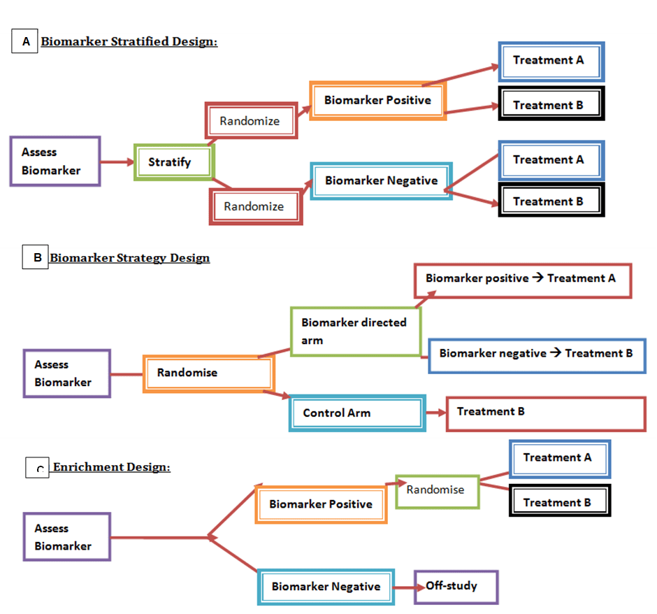 Figure 2: The main types of RCT designs. (A) Biomarker-stratified medicine: stratify followed by randomization where patients are differentiated into biomarker positive or biomarker negative, and depending on which group a particular treatment is give. Biomarker -strategy design: (b) to assess biomarker randomisation takes place, those on the biomarker-directed arm are divide into biomarker positive and negative where they differ in treatment, however the control arm has only one plan (c) Enrichment design: Those that are biomarker positive undergo randomisation where a treatment will be given, whereas those that are biomarker negative are off-study.