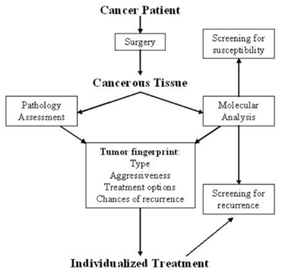 Microarray expression profiling can be used in several cancers to determine pathological subtypes and predict responses to therapeutic outcomes. Key examples are haematological malignancies, lung, breast, kidney, and other neoplasia’s. From a bedside perspective, molecular profiling appears to be a potential technique to identify biomarkers in renal cell carcinoma by analysing protein and gene expression. This aids in decision-making for kidney cancer patients and develops novel targeted therapeutic responses. The patient undergoes surgery and a biopsy of the cancerous tissue is removed for pathology assessment and molecular analysis. This helps to screen for susceptibility, and recurrence and helps classify the tumour type, and aggressive behaviour to help identify the treatment options in an individualized manner.