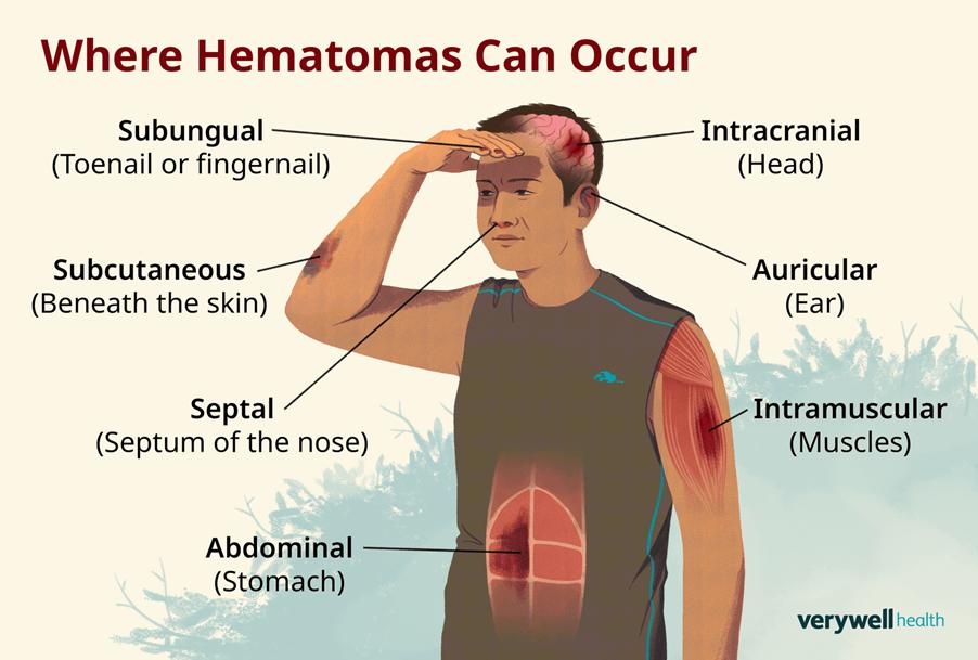 The most frequent blood complication is traumatic haematoma when the needle is removed. A haematoma is defined as the accumulation of blood in the tissues that clots, forming swelling. It is vital to apply pressure and use ice to compress the affected area upon needle removal to prevent the formation of a haematoma intramuscularly. Please see Figure 46. Haematomas that arise from blood donations are typically small, with rare chances of affecting other tissues that are in close proximity. Other forms of haematoma arise when there is an injury, raising pressure in the skull, with a potential tear of the blood vessel, and require surgical treatment.
