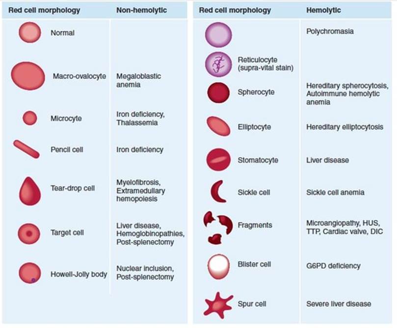 Amongst the classifications of anaemia is the differentiation between haemolytic and non-haemolytic anaemia. Haemolysis is the destruction of red blood cells. There are distinctive shapes (morphology) of the erythrocytes as presented in Figure 17. An example of non-haemolytic anaemia is megaloblastic anaemia, characterised by the presence of large oval-shaped erythrocytes (macro-ovalocytes). This condition is caused by the delayed maturation of erythroblasts (immature or early red blood cells) (Ballinger and Pratchett, 2003). As presented in Figure 18, the erythrocytes appear large, and the neutrophils have nuclei with a minimum of six segmented lobes. This is two-fold higher than typical neutrophils, which have three segmented nuclear lobes. The lobes are connected by tapering chromatin strands in both normal and hypersegmented neutrophils.