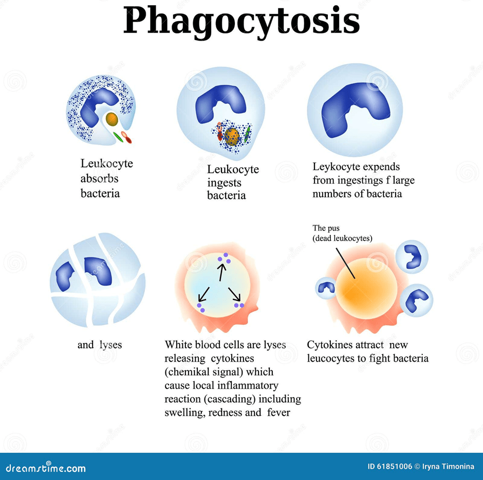Monocytes are small leukocytes that circulate in the blood. They differentiate and develop into macrophages when migrating into tissue. Macrophages are antigen-presenting cells that trigger an immune response. They receive a signal when there is a damaged part in the body. An example is interleukin (IL-1) secreted by macrophages, which can give rise to fever. They are amongst the primary immediate defences where they engulf and digest pathogens without specificity via the enzymes present before other white blood cells reach them (Dean, 2005). This process is called phagocytosis, please see Figure 6. There are different types of macrophages. Kupffer cells in the liver remove remaining harmful substances from the blood. Alveolar macrophages present in the air sacs in the lungs remove harmful objects inhaled. Macrophages in the spleen remove damaged or old erythrocytes and platelets from the blood circulation.