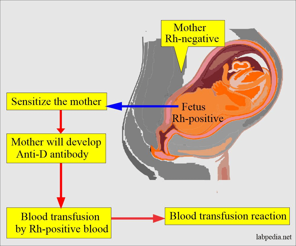 The Rh factor was first studied in rhesus monkeys as a model for experimental purposes. During pregnancy, some of the fetal erythrocytes cross the placental barrier into the maternal circulation. If the mother is Rh-negative and the fetus is Rh-positive, the mother produces anti-Rh antibodies. This mainly occurs during the separation of the placenta at delivery (Widmaier, Raff, and Strang, 2006). Please see Figure 12. The Rh-positive pregnancy rarely causes danger to the fetus because delivery happens before the mother makes the antibodies (Widmaier, Raff, and Strang, 2006).