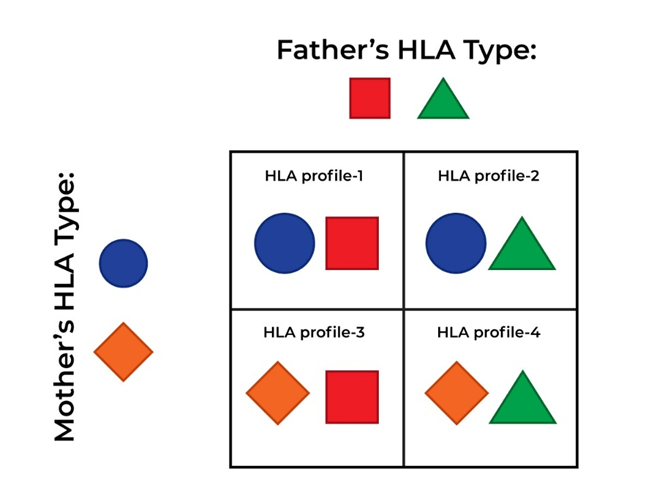 To identify an HLA type, a blood sample or a cheek swab is examined. The patient’s results will be compared with those of the patient’s relatives, who may be asked for their HLA type to find a donor match. HLA is inherited, and a parent or child can be a potential donor, as half of their DNA is obtained from either parent. Please see Figure 14. There is a 1 in 4 chance that a sibling who shares the same parents may be a full HLA match. However, immediate members are less likely to be a fully matched donor; there is 70% of being incompatible (National Marrow Donor Program, 2025). Other potential HLA matches could be someone from the same ethnic background (National Marrow Donor Program, 2025).