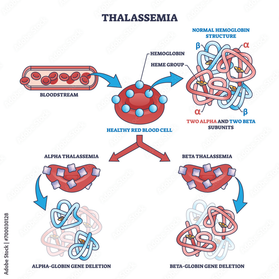 Other common causes of microcytic anaemia are thalassaemia and sideroblastic anaemia. Thalassaemia is a genetic disorder where there is a mutation (change in the gene) in the production of the protein (globin) of haemoglobin. The haemoglobin molecule is made of four globin chains: Two alpha and two beta chains. Both parents need to have the genetic mutation for the child to have this condition via prenatal diagnosis, please see Figure 25. This is referred to as thalassaemia major. Alpha thalassaemia arises when the alpha chain is mutated, whereas beta thalassaemia arises when there is a mutation in the beta globin chain. Other symptoms that may arise in response to the abnormal structure and production of haemoglobin is enlarged spleen (splenomegaly) and abnormal bone marrow (Ballinger and Pratchett, 2003).