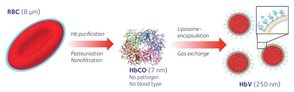 The artificial blood product is a haemoglobin vesicle (HbV) encapsulated in a PEGylated phospholipid. Please see Figure 48. It has a mean particle diameter of 225- 285 nm and mimics the function of natural red blood cells. It has high efficacy and longer therapeutic time when higher dosage is used. This enables HbV to carry oxygen for several hours in patients with haemorrhagic shock until a transfusion of packed red blood cells (PRBC) arrives.