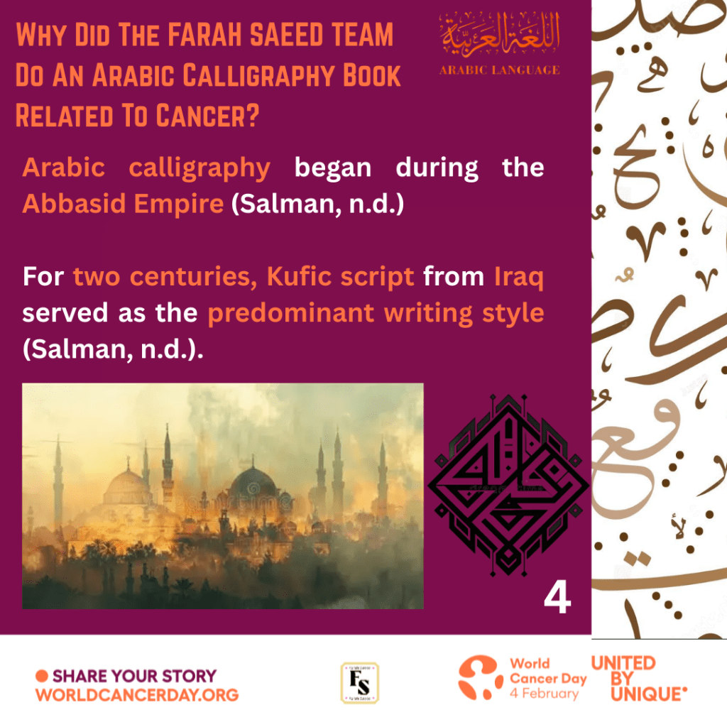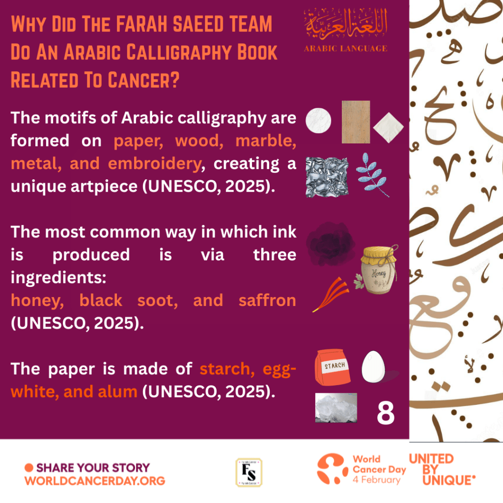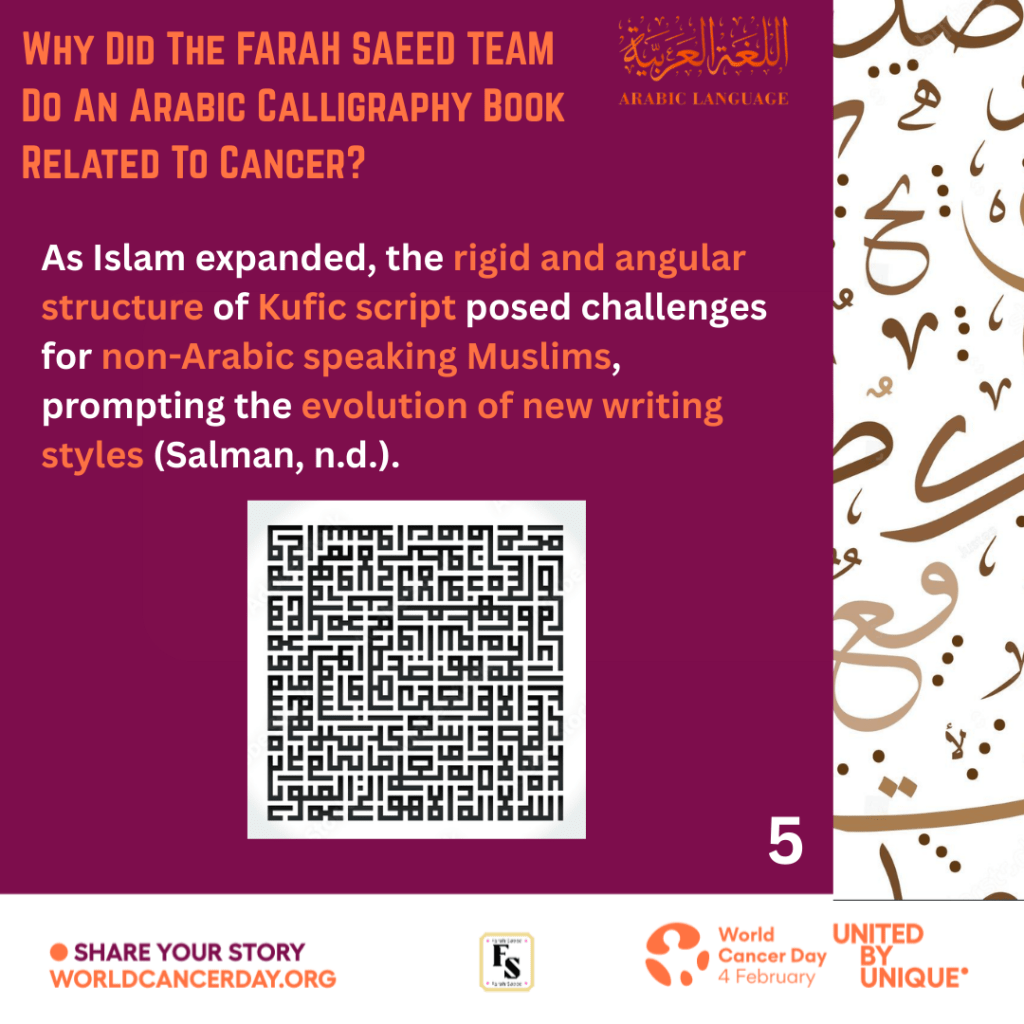 Dr Farah Saeed was an Arabic inspirational figure, and to connect with the theme of how cancer patients feel. We aimed to create a cultural fusion between Arabic calligraphy and the emotions that cancer patients may feel on their journey.