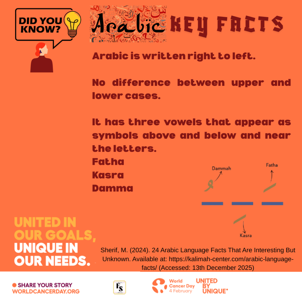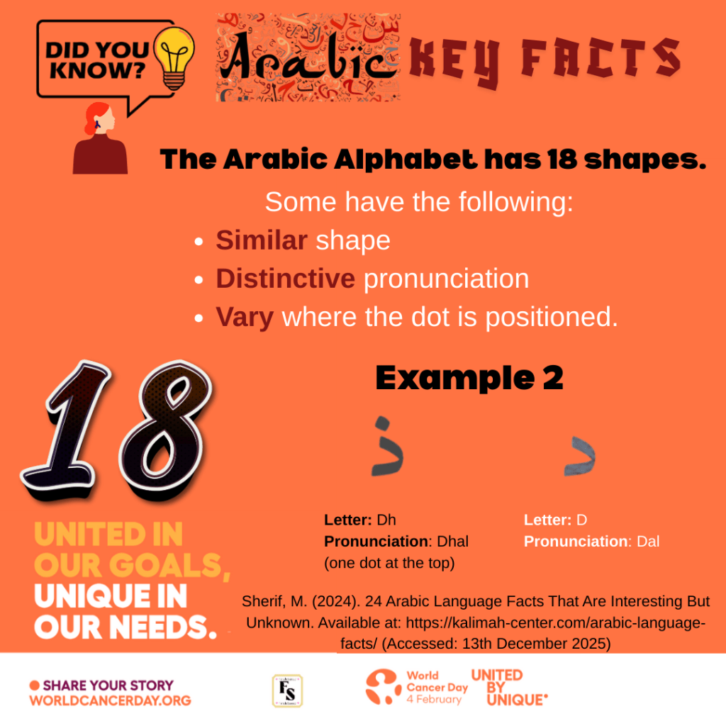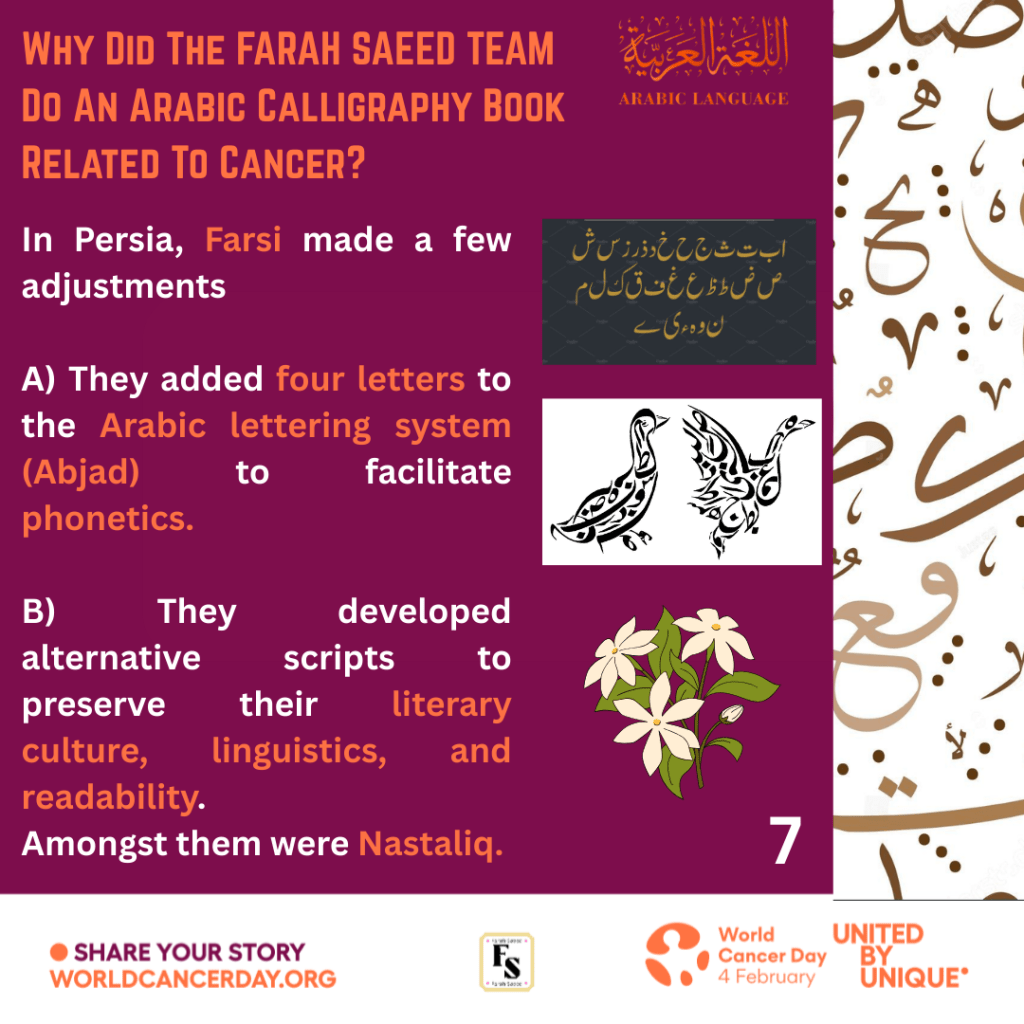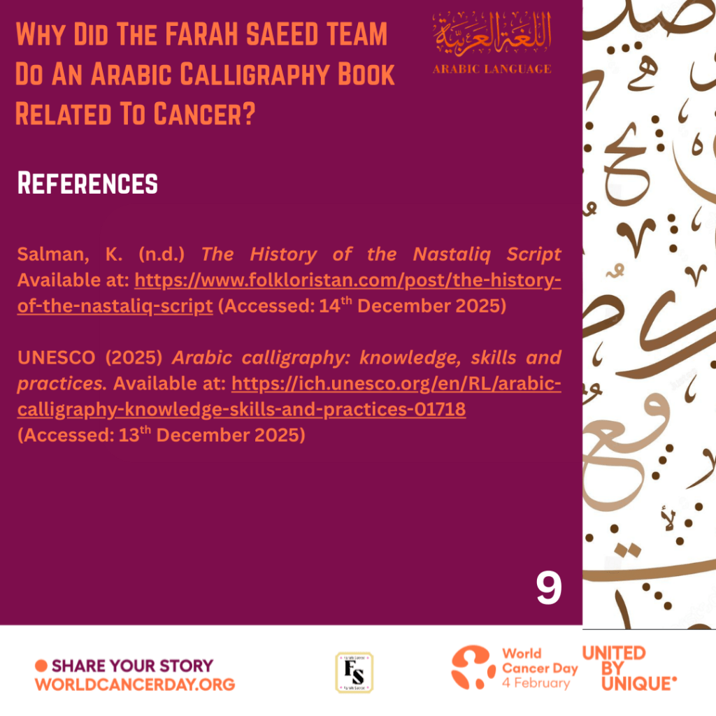 Dr Farah Saeed was an Arabic inspirational figure, and to connect with the theme of how cancer patients feel. We aimed to create a cultural fusion between Arabic calligraphy and the emotions that cancer patients may feel on their journey.