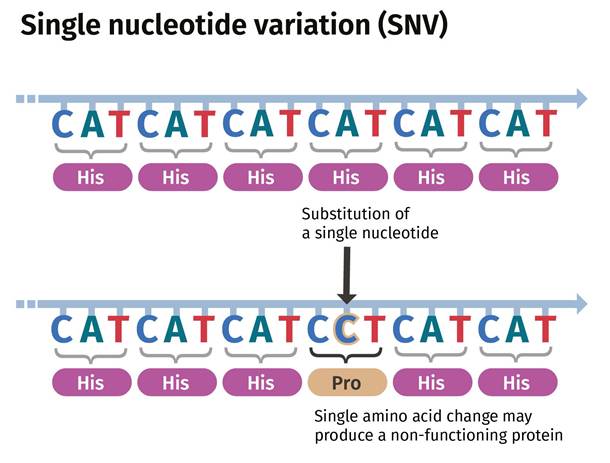 Single Nucleotide Variation (SNV) refers to a change within a single nucleotide in a DNA sequence that can occur in germ cells (sex cells) or somatic cells (body cells). As illustrated in Figure 3, three of the bases, cytosine (C), Adenine (A), and Thymine (T), produce the amino acid histidine. Amino acids are the building blocks that make protein. A change in the single nucleotide from A to C is considered an SNV. This produces a non-functioning protein.