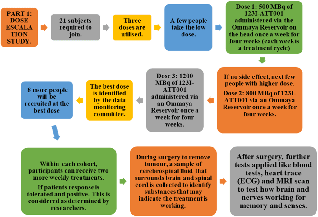 The aim is to determine the safety and effectiveness of 123I-ATT001 as illustrated in Figure 3. A series of safety measures was applied. It is vital that trained members of the research and clinical team administer the drug to the patient, take blood, and place the Ommaya reservoir. A radiology specialist reviews the maximum dose and the number of scans acceptable. This helps to lower bruising due to bleeding, infections, and small head bumps, and low radiation exposure (Trial team and Mulholland, 2024; Cancer Research UK, 2025c).