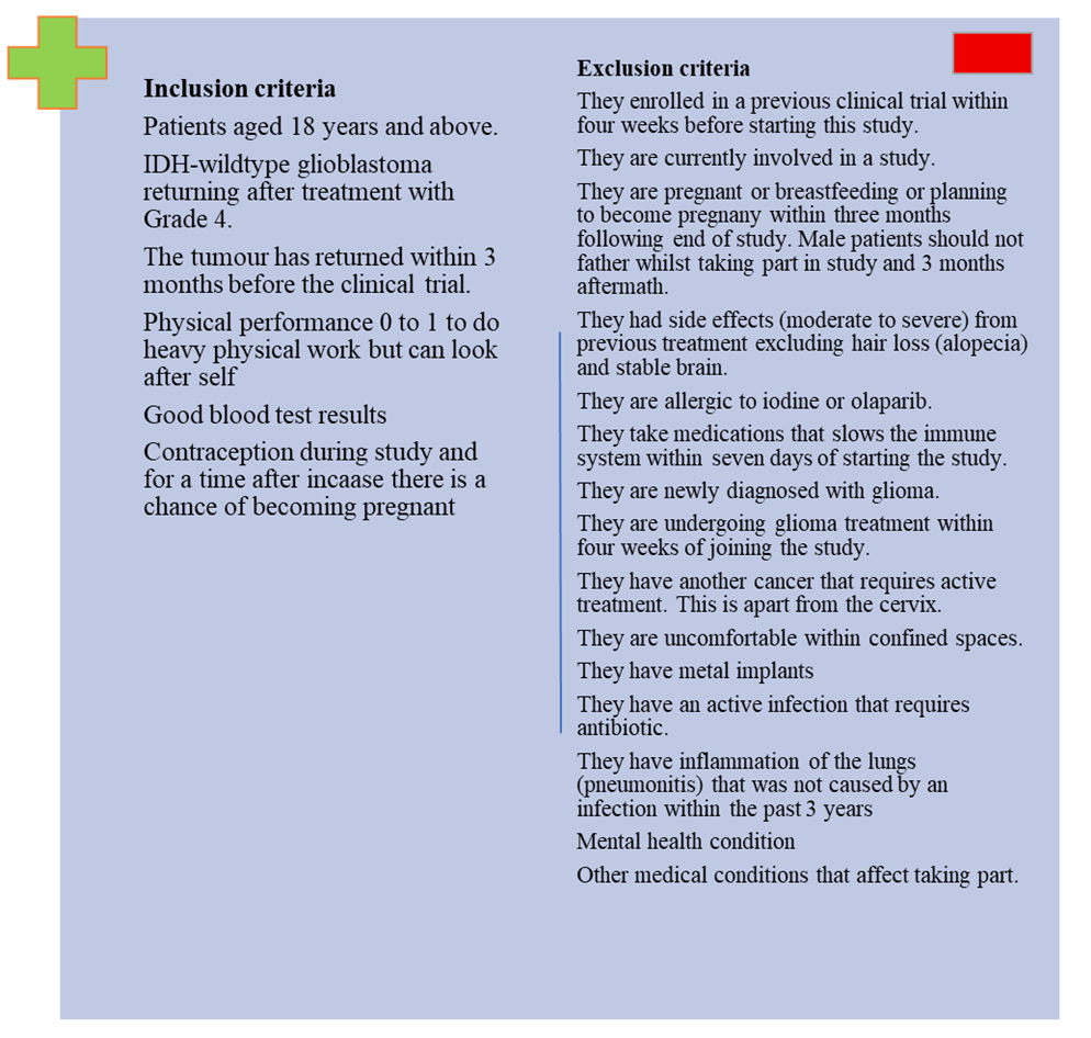 Figure 4: A summary of the criteria for including and excluding participants in the 123I-ATT001 study (Trial team and Mulholland, 2024; Cancer Research UK, 2025c)