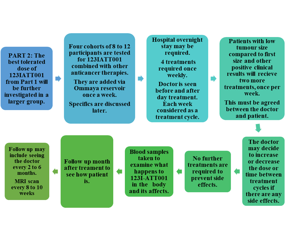 The study was divided into two parts: the first part was to identify the maximal tolerable dose of 123I-ATT001. Please see the summary of the steps involved in Figure 5. Once confirmed, the second part of the study aimed to increase the number of subjects with this dose in combination with other therapies. The effectiveness of 123I-ATT001 was monitored by routine blood tests, cerebrospinal fluid, and measuring the impact on the heart and brain via scanning (Trial team and Mulholland, 2024; Cancer Research UK, 2025c). Please see Figure 6.