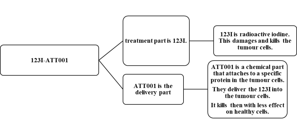 As presented in Figure 2, the origin of 123I-ATT001 consists of radioactive iodine and a chemical that helps with binding to specific proteins in the tumour cells and then undergo apoptosis (Trial team and Mulholland, 2024; Cancer Research UK, 2025c).
