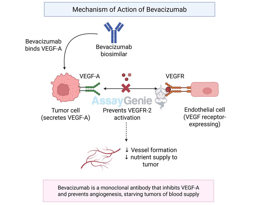 Bevacizumab is an antiangiogenic agent that targets VEGF. VEGF is part of a family of six structurally-related proteins (VEGFA, VEGFB, VEGFC, VEGFD, VEGFe, and placental growth factor) whose role is in the production, growth, and differentiation of the blood vessels (angiogenesis) and lymph vessels (lymphoangigenesis). The predominant angiogenic effects are elucidated primarily by VEGF, one of its receptors, VEGFR-2. As Figure 2 shows, the Bevacizumab biosimilar binds to VEGFA, which is secreted by the tumour cell. This prevents the binding of VEGF-A to VEGFR2 on the endothelial cell lining. This also blocks the formation and decreases the nutrient supply to the tumour.