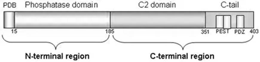 PTEN is a protein composed of 403 amino acids. There are primarily two regions: N-terminal and C-terminal. The N-terminal region is composed of 185 amino acids (positions 1–185) with a PIP2-binding domain (PBD) and a phosphatase domain of 218 amino acids (positions 186–403). The C-terminal region consists of a C2 domain and a tail. The tail comprises two PEST (proline, glutamic acid, serine, threonine) sequences and an ending with a PDZ-interaction motif (Molinari and Frattini, 2014).