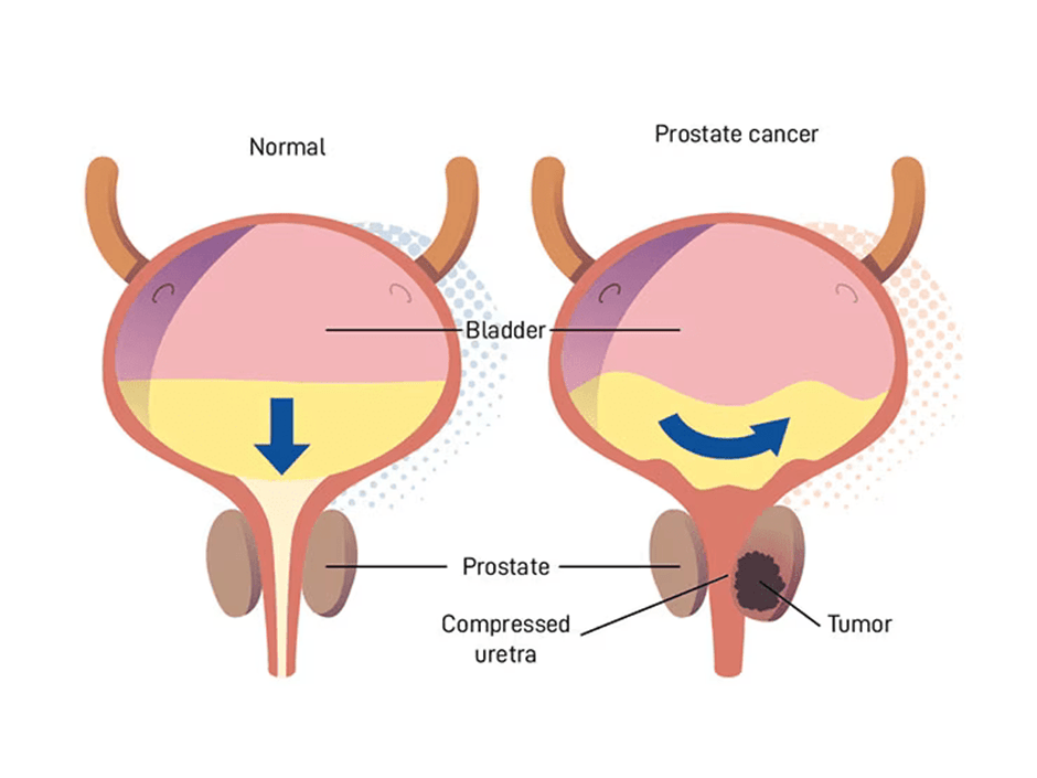 The first diagnostic method following symptom assessment is the digital rectal examination (DRE), where the healthcare professional places a finger up the back passage of the patient to assess whether the prostate gland has increased in size. An enlarged prostate gland (benign prostatic hyperplasia) influences how urine is stored in the bladder and how urine leaves the body via the urethra (micturition). This can be explained by its anatomical position under the bladder.