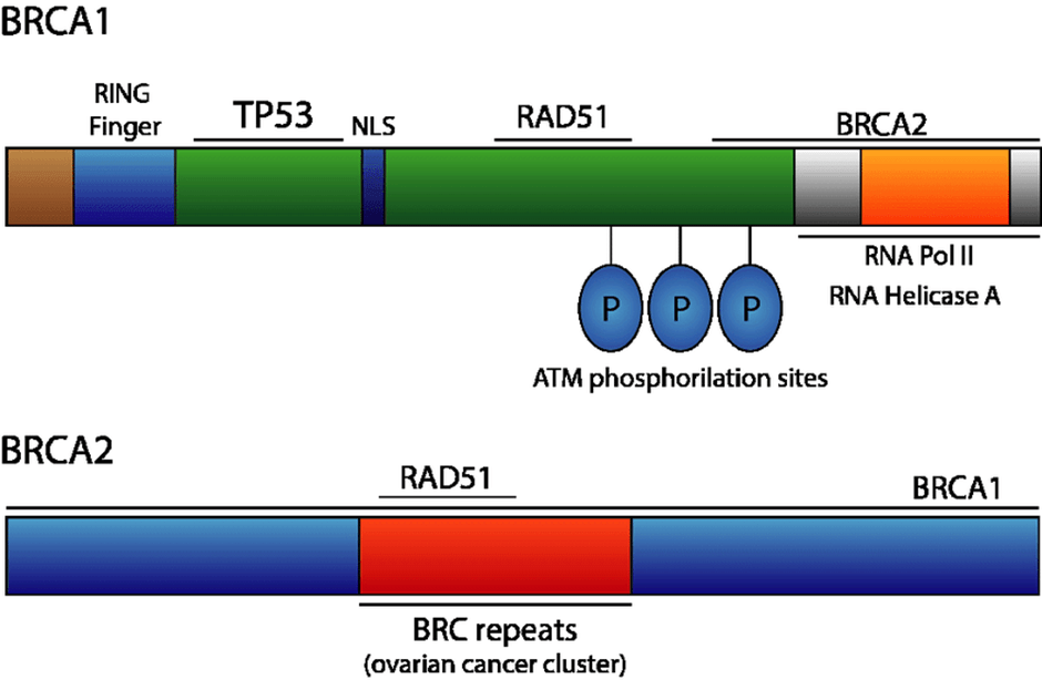 The BRCA2 gene consists of 27 exons and encodes a 3418 amino acid nuclear protein that is larger in size; the molecular weight is between 350 and 380 kd. Several domains differ from those of BRCA1. The protein structure consists of a nuclear localization sequence, two functional domains: transactivation and DNA binding domain, and eight BRC-repeat motifs present in the central region whose primary role is in DNA repair (Zannini et al., 2025).