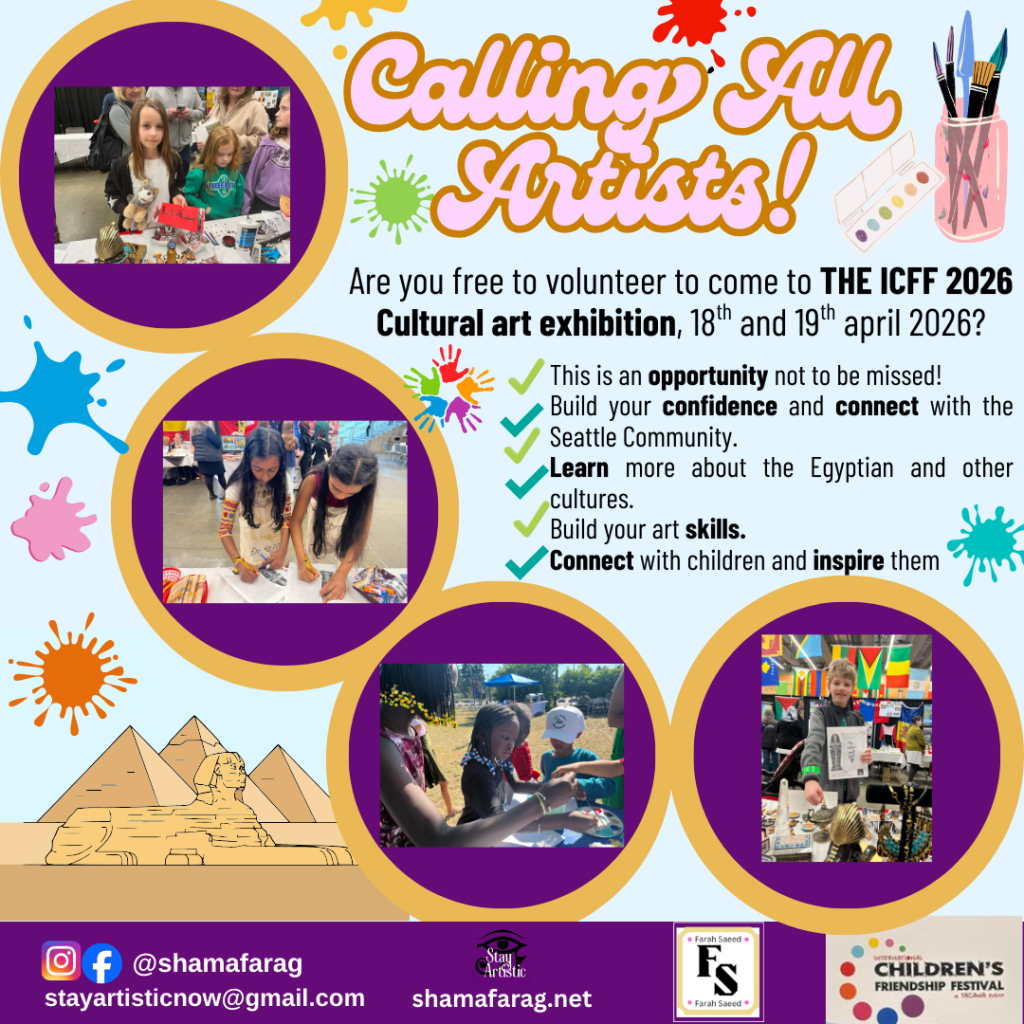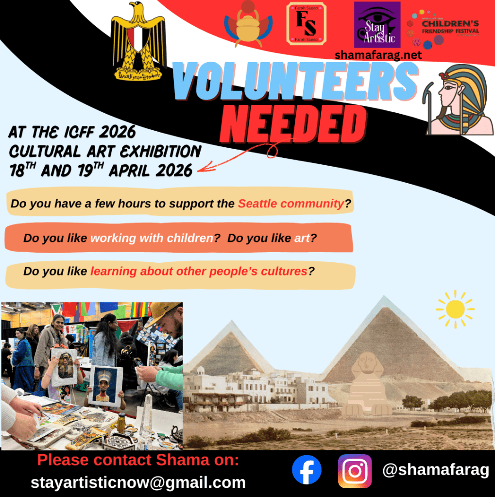 Experience the vibrant Egyptian Cultural Exhibit at the ICFF Seattle International Children’s Friendship Festival in the heart of the Pacific Northwest, Seattle! Discover Egypt’s rich heritage, captivating traditions, and inspiring art, and engage your senses in a celebration of culture that will leave a lasting impression. Don’t miss this unique opportunity to explore and embrace the wonders of Egyptian history for children! The Egyptian Cultural Booth is led by our inspirational Head of Writing, Shama Farag, founder of Stay Artistic—an independent initiative connecting cultures to ignite multicultural understanding through art, cuisine, books, storytelling, and history.