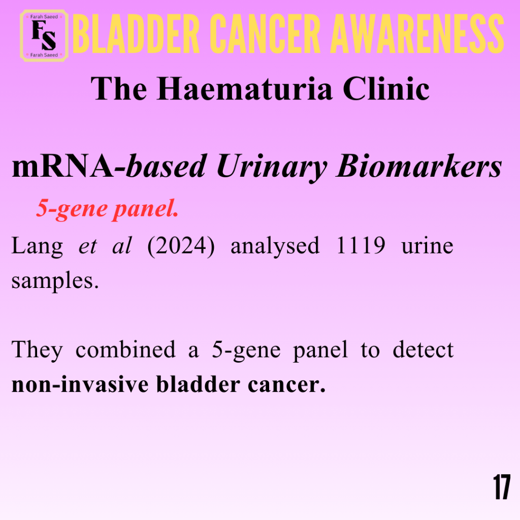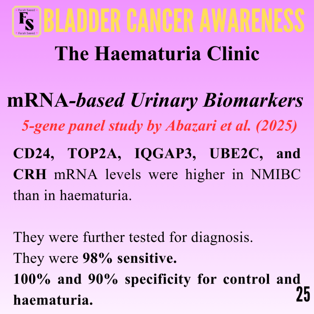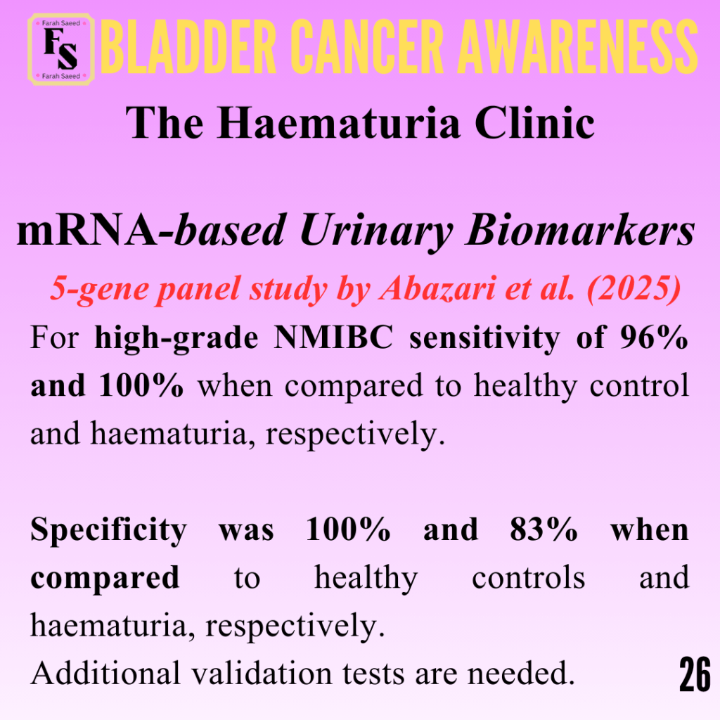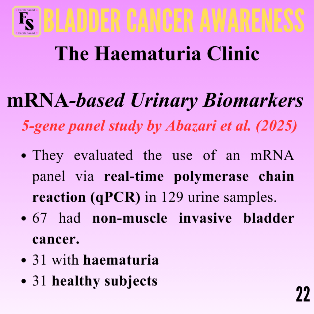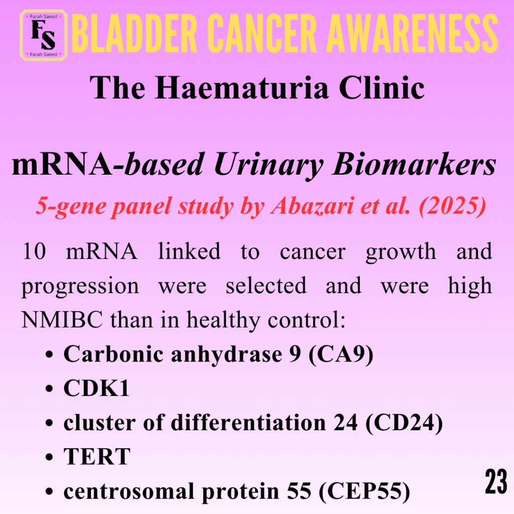Abazari, O., Shahidi, M., Dayati, P., Valizadeh, S., Vahidi, S., Tafti, M.A., and Zavarreza, J. (2025). Study of urine-based mRNA biomarkers for early detection of nonmuscle invasive bladder cancer (NMIBC). Urologic Oncology Seminars and Original Investigations, 43(6), pp.393.e9–393.e17. doi:https://doi.org/10.1016/j.urolonc.2024.12.273.