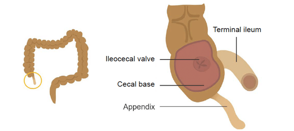 There is less irritation of food contents that have been broken down in the small intestine, low water in faeces and slower transport of stool in large intestine. This is why most cases occur in the first segment of the small intestine (duodenum). The acidic conditions from the stomach contents (chyme) can cause irritation but is neutralised with the bile released from the gall bladder. However, in some cases the bile (alkaline) can also cause irritation (Khosla et al., 2022).
