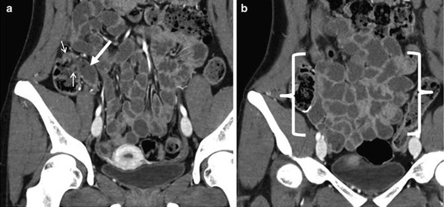Coronal CT enterography images of the small bowel. The terminal ileum is presented at the white arrow. The small arrow indicates the ileocecal valve which is the haustral fold of the caecum (first segment of the large intestine. The distal ileum is between the brackets. There is thin walls and decreased mural enhancement which indicates inflammation or altered perfusion (Abdominal Key, 2017)