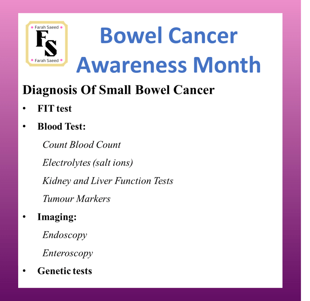 No official screening test for small bowel cancer which is why it is commonly detected in the later stage where it is 7 and 8 months from symptoms (Ceresi et al., 1995). There appears obstruction in the intestines (22-26%) and perforation (6-9%).