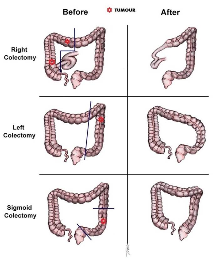 Right hemicolectomy or ileo-caecal resection that may also include ileocolic artery and associated lymph nodes for tumours of the ileum. The procedure involves removing the caecum and the distal part of the small bowel referred as terminal ileum. Comparing with segmental colectomy, right hemicolectomy has a longer specimen, more lymph nodes harvested and with risk of greater tumour and functional damage (Huang, 2024).