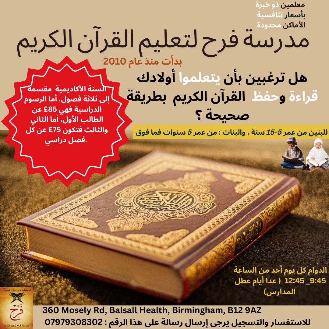Second: Memorizing as many Surahs as possible from the Holy Quran, starting with Juz’ Amma. - Open every Sunday from 9:45 to 12:45 (except school holidays)