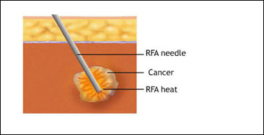 Using imaging devices, electrodes carrying radiofrequency is inserted percutaneously into the tumour.