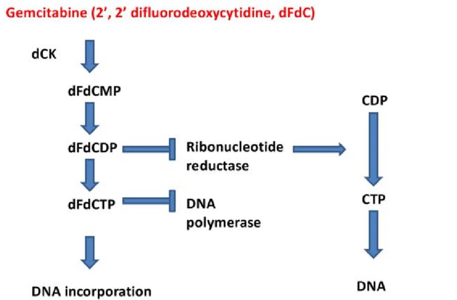 The active forms: gemcitabine diphosphate and gemcitabine triphosphate prevent DNA production and is positioned at the end of the DNA strand. The DNA polymerase is unable to continue proofreading the template nor can it be removed. This causes cancer cell death. (Plunkett et al. 1995)