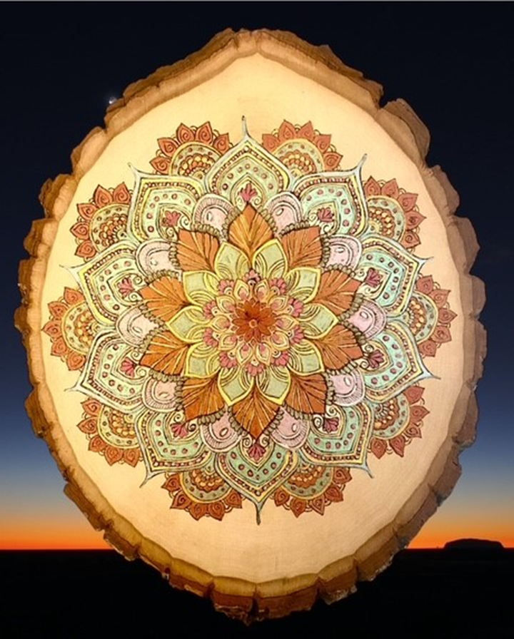 This vibrant mandala is wood-burned onto a natural Birch wood slice, with the bark edge framing the design like a window into serenity. The pattern features intricate, symmetrical layers of floral and paisley motifs, blending geometric precision with organic flow. Warm water colour tones of golden yellow, burnt orange, and earthy reds are complemented by soft pastels like mint green and lavender, bringing a gentle contrast to the bold lines of the pyrography. The combination of fine wood burning and hand-colouring gives it depth and texture.