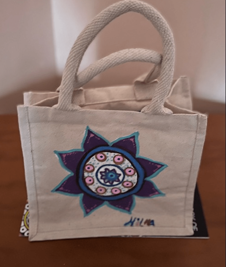 This mandala depicts vibrant life events in numerous circles, set in peace and tranquility. As an advocate against domestic violence, Hilma used the colour purple in most of the patterns presented on her art piece bag. It represents how love is not abuse. Say NO to domestic violence.