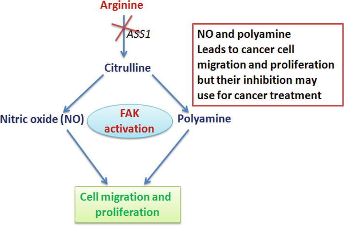 High levels of nitric acid can activate focal adhesion kinase (FAK) which can assemble the integrin protein. FAK is activated by high levels of nitric oxide (NO). Low levels of ASS1 lead to low production of arginine and less cancer cell migration. In order for cancer cell migration and proliferation to occur, arginine needs two enzymes nitric oxide synthase and arginase1 (Narayan and Kashyap, 2021).