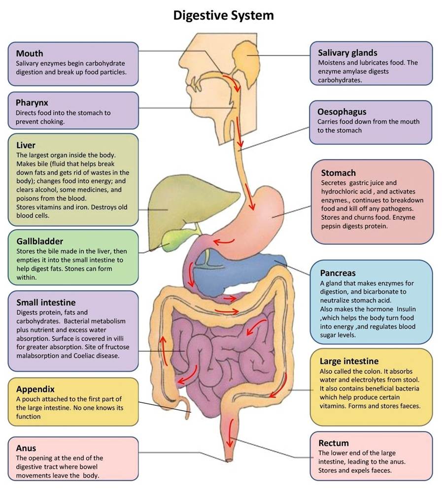 The link between the oral cavity and the digestive system is essential. The oral cavity is the starting point where food is tasted via the taste buds on the tongue. As the food is eaten, it is chewed by the teeth and mixed with a liquid called saliva (spit) that helps to moisten the food with the support of the muscular tongue. This forms a bolus and is then swallowed and enters the food pipe (oesophagus). The saliva also contains enzymes that help break down food, more specifically starch (carbohydrates), large molecules, to form smaller substances. This helps the bolus pass through the foodpipe and into the stomach (Cleveland Clinic, 2023).