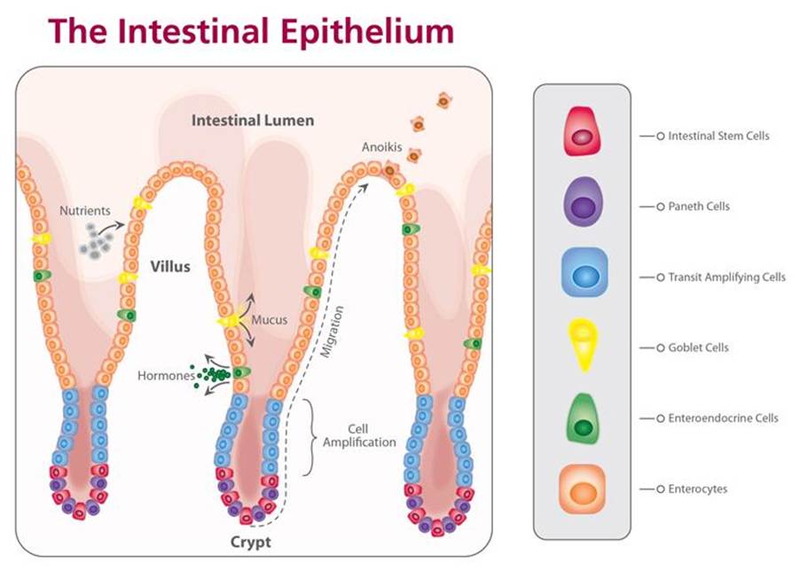More specifically, carcinoid tumours, otherwise known as argentinoffanoma, roots from the argentaffin cells. Argentaffin cells are a type of enteroendocrine cells that align the digestive system. Carcinoids also arise in enterochromaffin cells called Kulchitsky cells that are found in pockets called crypts of Lieberkühn that line the small intestines. The small intestine is where food is digested and absorbed into the body to target tissues that require the nutrients. Please see Figure 5. These cells secrete 5-hydroxytryptamine (serotonin) and prostaglandins that assist with the muscular movement of food in the bowel. Such chemicals are inactivated in the liver.