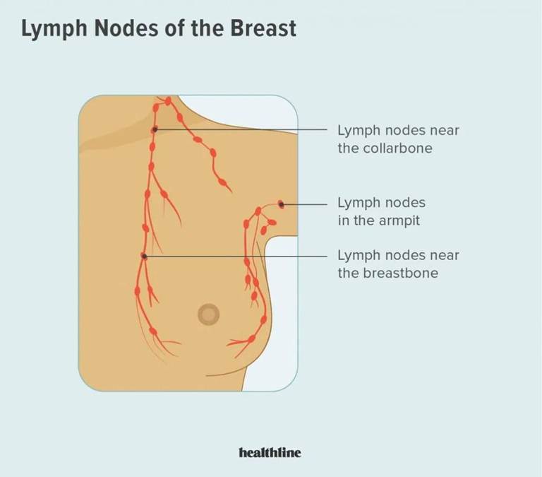 Cancer cells are able to affect other organs by travelling via the lymph. The lymph is a fluid that flows through the immune system. There are filtering structures called lymph nodes that collect waste products and drain them away. There are two nearby lymph nodes in the breast tissue: the axillary lymph glands near the armpit. There is the internal mammary chain that is in the centre of the chest and close to the breastbone (Cancer Research UK, 2023). Please see Figure 3.