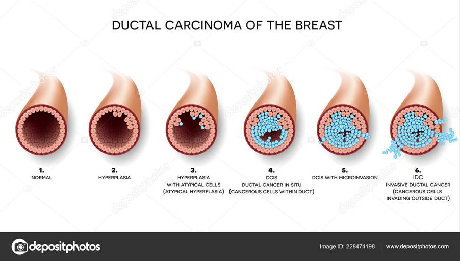 Cancers that remain in the lining of the ducts that carry the breast to the nipple or lobules that are found in the lobes of the glandular tissues that produce milk for breastfeeding and connect to the ducts (World Cancer Research Fund, 2025a). They are referred to as in situ and are found in the early stages(Cancer Research UK, 2023).