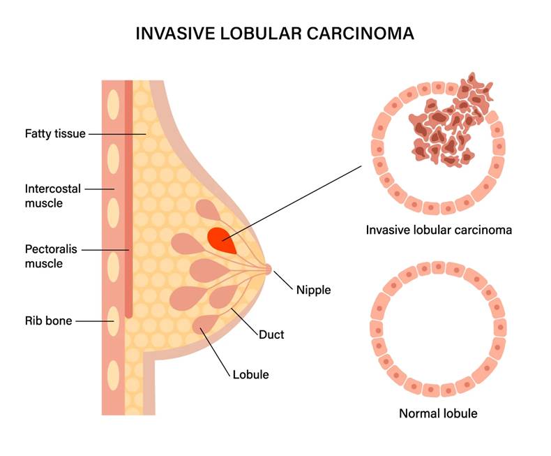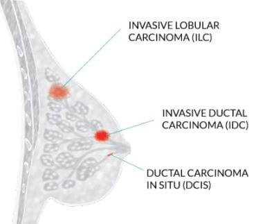 Cancer cells become invasive when they grow uncontrollably and spread to nearby breast tissue, forming lumps (World Health Organisation, 2025; Cancer Research UK, 2023). Invasive breast cancer indicates that the cancer has spread outside the ducts and surrounding tissue (Cancer Research UK, 2023). Invasive lobular breast cancer is the second most common cancer, and it has spread outside of the lobules and surrounding breast tissue (Cancer Research UK, 2023). Please see Figure 2.