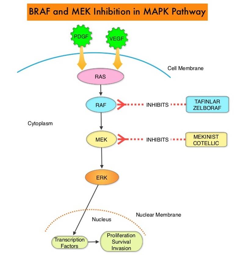 They are involved in the mitogen-activated protein kinase (MAPK) pathway that transmits a signal into the nucleus to regulate gene transcription of target genes involved in proliferation, growth, and survival to generate cellular response. BRAF is activated by upstream kinases RTK to activate MEK1/2.
