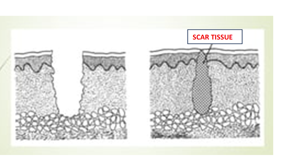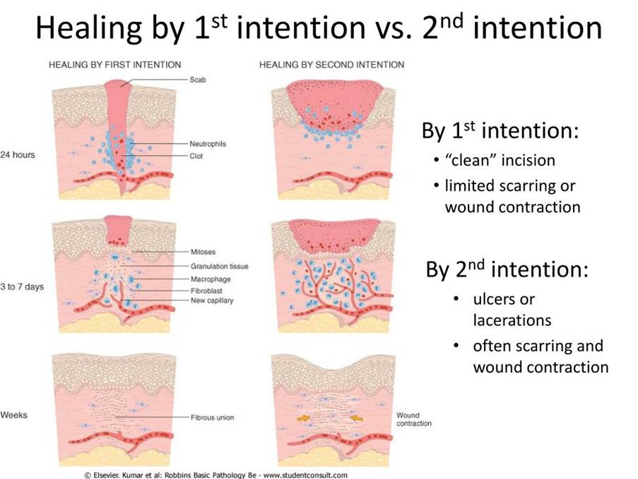 Secondary intention healing: if the defect size is large, the wound edges cannot undergo primary intention healing. Instead, there is granulation tissue growth and contraction.