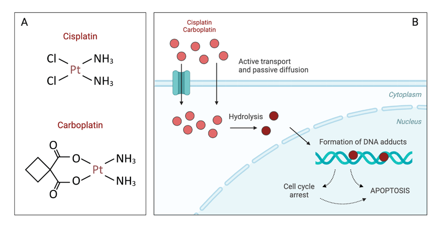 This is a platinum based DNA alkylating drug that causes crosslinks and formation of inter and intrastrand DNA breaks. This prevents growth of cancer cells and causes cell death (apoptosis).